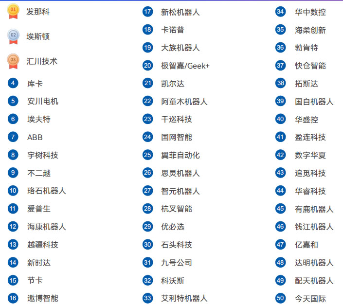 匯川技術,珞石機器人,越疆科技,節卡,埃斯頓,遨博智能,埃夫特,海康機器人,新時達,大族機器人,阿童木機器人,新松機器人,極智嘉/Geek+